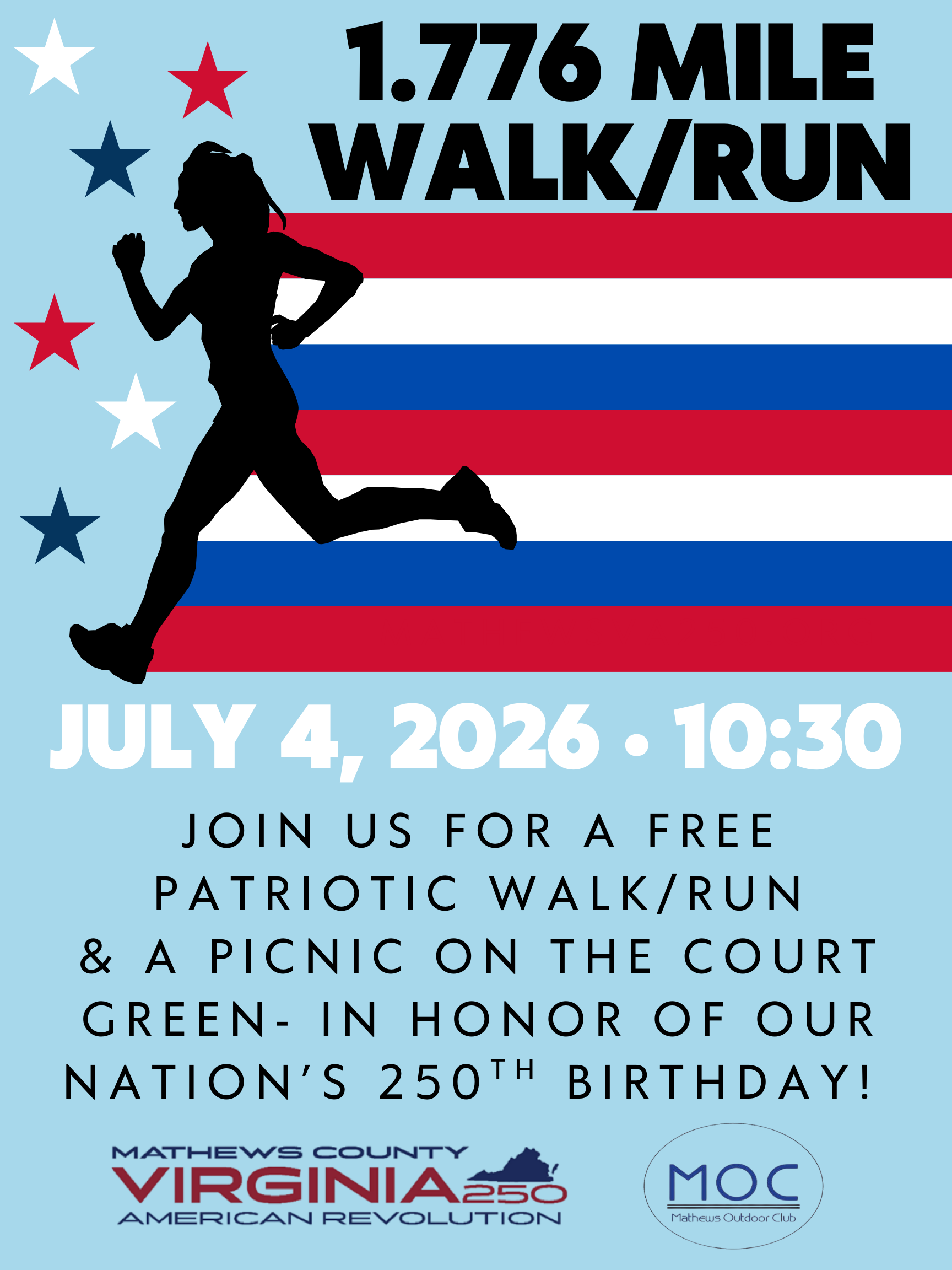 Join the Mathews VA250 in celebrating the Semiquincentennial of our nation with a patriotic walk/run and picnic – ALL FREE – on July 4th! Stay tuned for more info- but mark your calendars for this historic event!