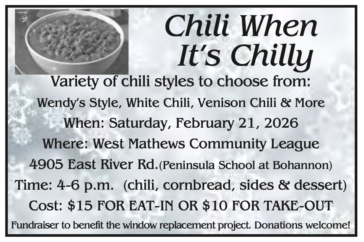 Warm up with the West Mathews Community League for a chili fundraiser to help raise money to replace the windows in the Peninsula School building. Includes chili, cornbread, sides and dessert! $15 to dine-in, $10 for take-out.