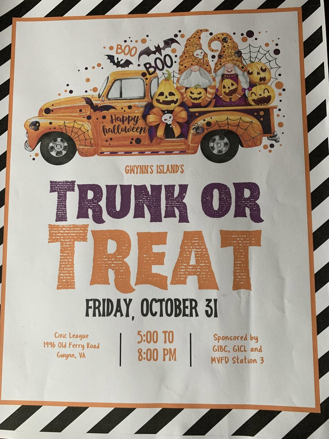 Join the Gwynn’s Island Civic League, Gwynn’s Island Baptist Church, and Mathews Volunteer Fire Department, Station 3 for a Trunk or Treat event for the whole family!
