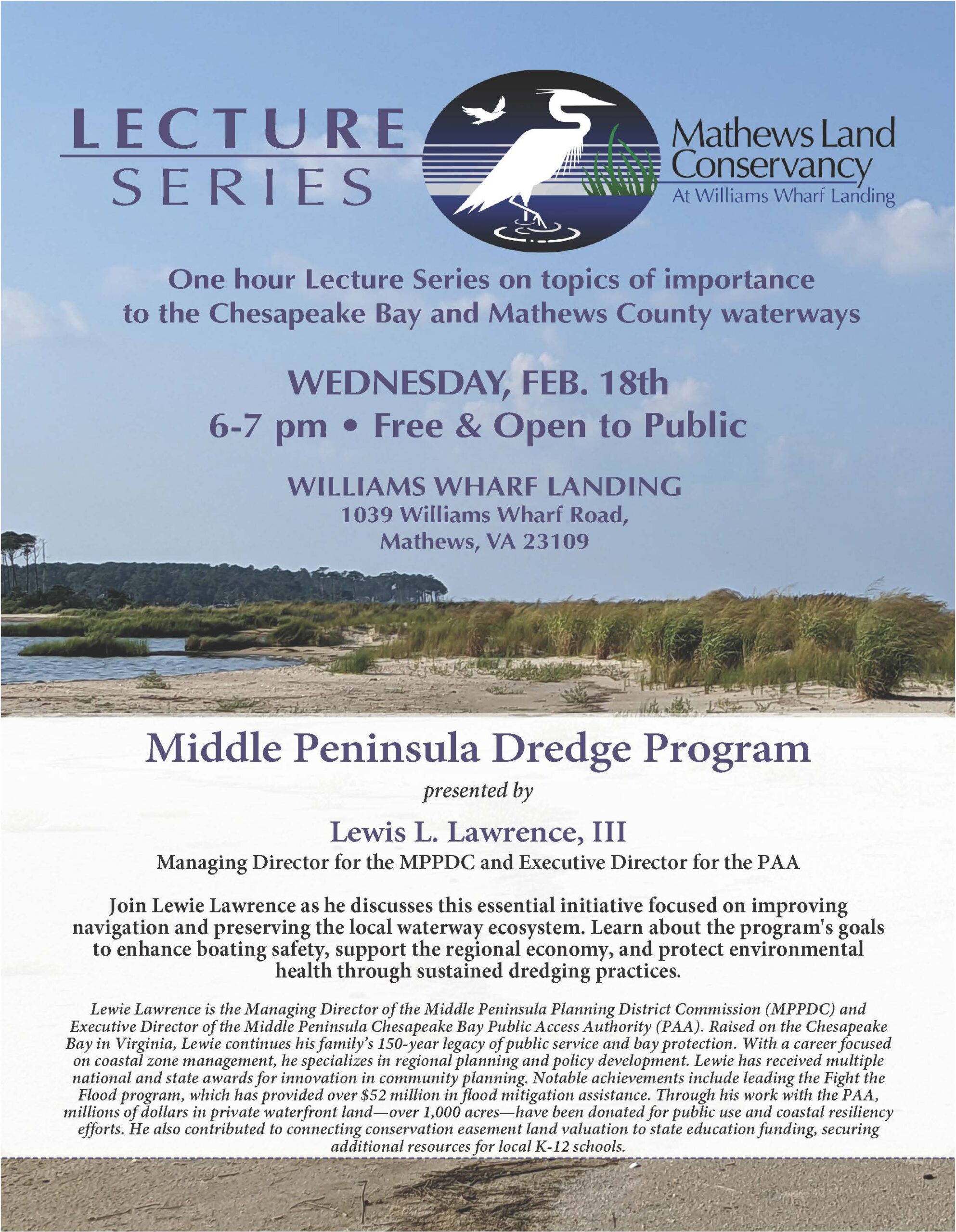 Join the Mathews Land Conservancy and Lewie Lawrence as he discusses this essential initiative focused on improving navigation and preserving the local waterway ecosystem. Learn about the program’s goals to enhance boating safety, support the regional economy, and protect environmental health through sustained dredging practices. This event is free and open to the public.
