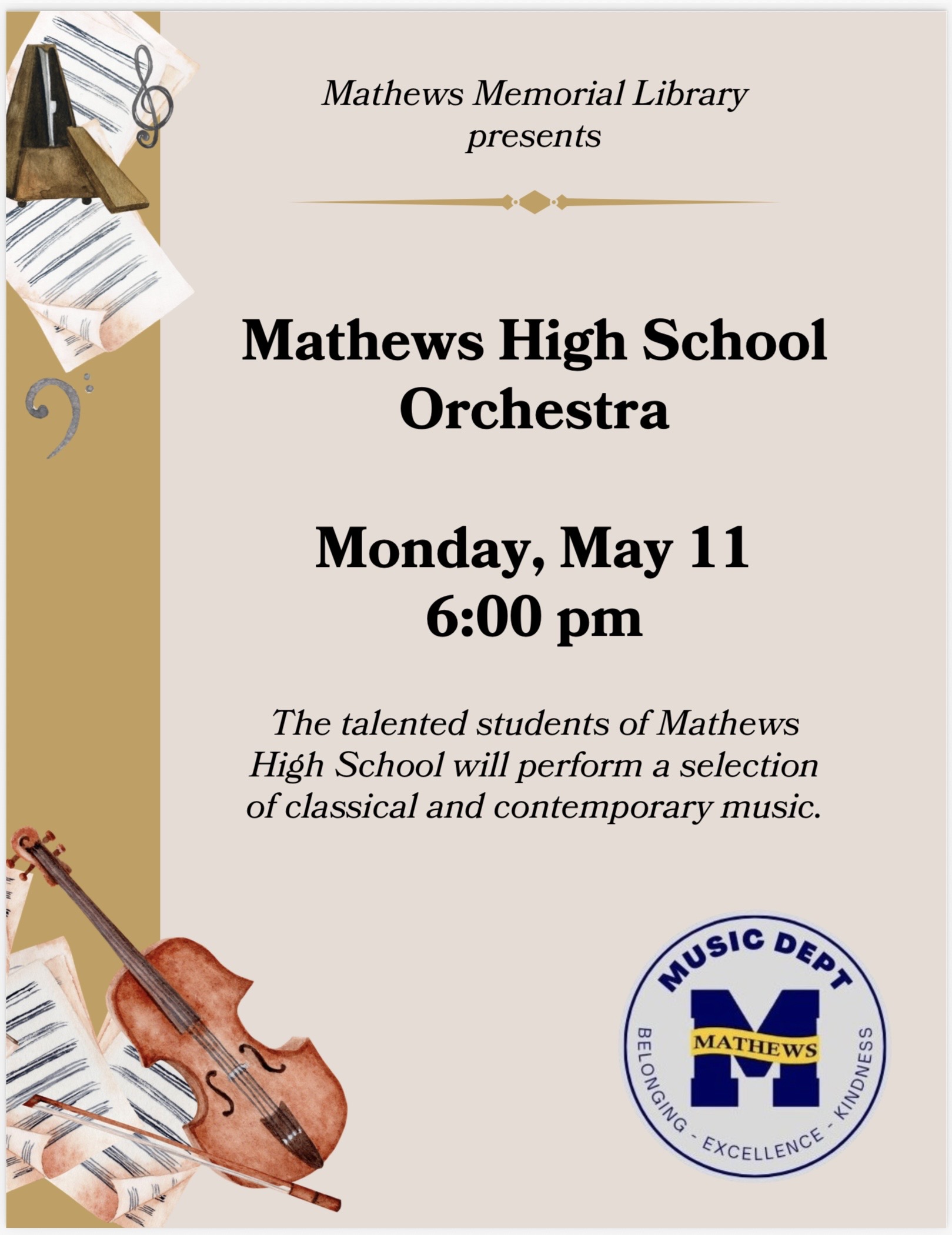Mathews Memorial Library 251 Main Street, Mathews, VA, United StatesMathews Memorial Library invites you to support our student musicians by attending this free event! MHS Orchestra 2026